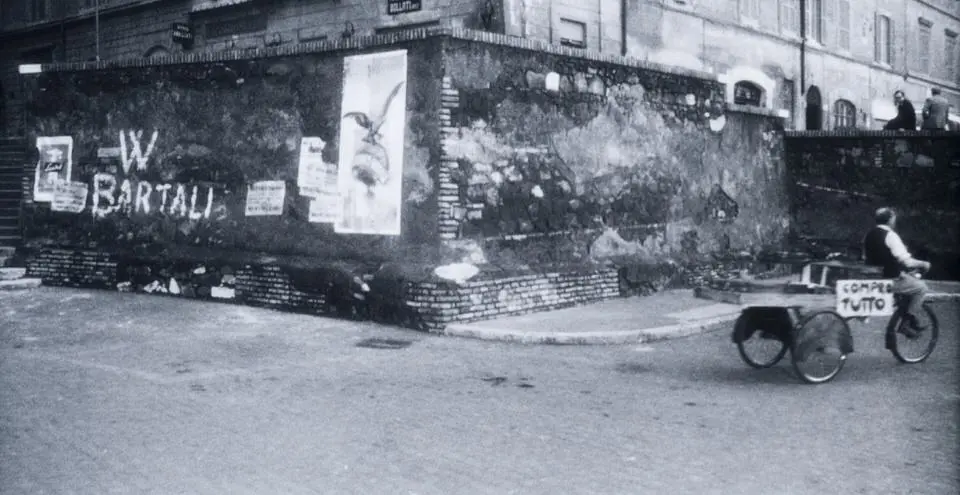 Antonio, a hospital porter at San Camillo (Istituto San Michele in piazzale Tosti), meets Luciana and, desperate to go out with her, agrees to accompany her to a play: the exterior of the theatre is galleria Sciarra, the covered pedestrian pathway in the central Trevi neighbourhood. The relationship works until Gianni arrives and takes Luciana from his friend: the two ride bicycles through the Aventino neighbourhood and happily plan a future together.