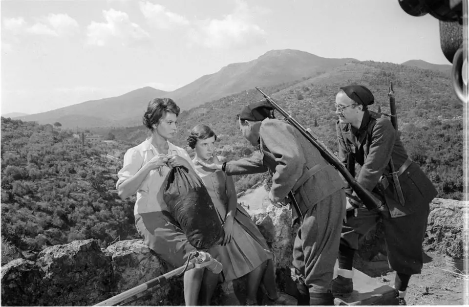 The film, based on the novel of the same title by Alberto Moravia, was adapted by the director Vittorio De Sica with Cesare Zavattini. The story of Cesira (Sophia Loren) and her daughter Rosetta begins in Rome, in the streets of the ancient neighbourhood of Trastevere, where Cesira has a shop in via Giulio Cesare Santini.