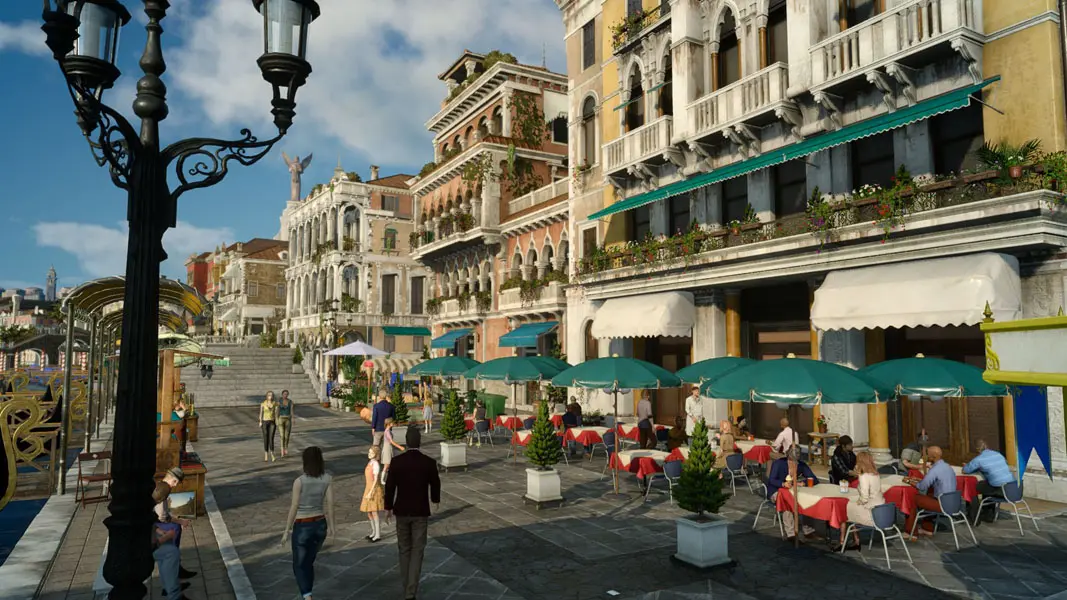 The city of Altissia, which features in Final Fantasy XV, was inspired by Venice. Not only because it is defined as the ‘City of Water’, but because the canals, bridges and architecture are directly reminiscent of the city. The city’s cathedral is clearly modelled on St. Mark’s Basilica, and there’s a location inspired by the Riva degli Schiavoni waterfront. Some of the banners also recall the red and yellow of the flag of St. Mark. Also, among the water-based means of transport featured are actual gondolas (with gondoliers to boot). Finally worth mentioning are the details such as the kiosks and umbrellas outdoors.