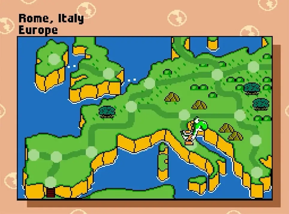Mario is Missing! is an atypical game in the Mario series. Indeed, it isn’t one of Nintendo’s classic platform games in which the player takes control of the plumber Mario. This time Mario has been kidnapped, and the arduous task of saving him is up to Luigi. Mario is Missing! is an educational game: the player guides Luigi on a journey around the world in discovery of its most famous landmarks. Each level is set in a different city, from which the Koopa Troopas have stolen certain artefacts. Luigi must recover them and return them to where they belong.
