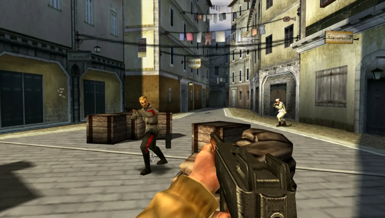 The first five missions take place in various locations in Southern Italy. In the first, John Baker and his fellow soldiers land and fight the enemy in the hills of Paestum. In the second and fourth missions the scene shifts north, to a town in the Apennine mountains: here the player must recover Enigma, a machine for encoding and deciphering messages and toppling the enemy forces. In the third mission the player participates in the landings in Salerno (Operation Avalanche) of the British and American forces. Last but not least, on the fifth mission the player takes control of Naples. Due to the graphic limitations of the game platform, the details in the settings are not enough to give a faithful reconstruction of real places. Worth mentioning is what is probably the profile of the Basilica dell'Incoronata Madre del Buon Consiglio in Naples, which can be seen in the distance during the battle in the city.