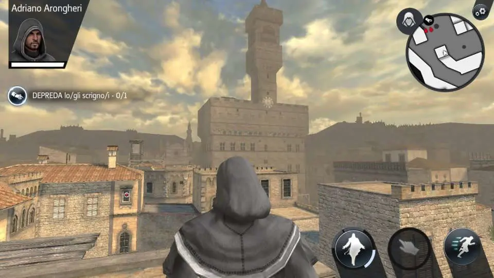 Italy is well represented: even in the mobile version, the reconstructions of Florence, Rome and Monteriggioni are identifiable. There are well-executed reconstructions of the main landmarks although they do have some historical inaccuracies: for example, in Florence, Palazzo Vecchio and the Cathedral of Our Lady of the Flower are placed together with a sculpture reminiscent of Perseus by Cellini, which is itself historically inaccurate: in 1502 (the year in which the game is set) it couldn’t have been there, as it was made between 1545 and 1554. In Rome the Colosseum and Castel Sant’Angelo are reconstructed. This version of the game does not support free roam mode (like in the original games in the series) and limits the player’s exploration to certain quarters and areas of the cities.
