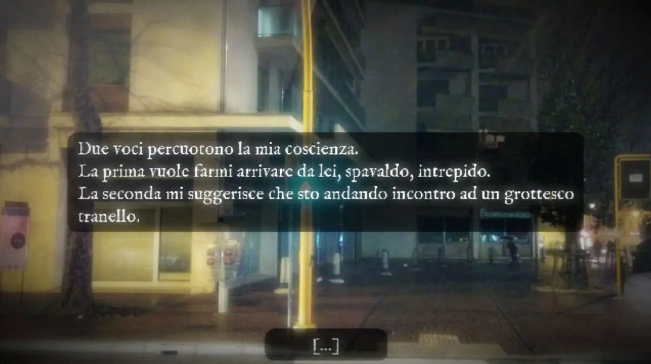 A point-and-click adventure made using real photographs of the city of Udine. The protagonist decides to go and meet a mysterious woman but must first solve puzzles and engage in dialogues with multiple choice answers. The photographs, dialogues and music were created by the developer, Alessandro Verona.