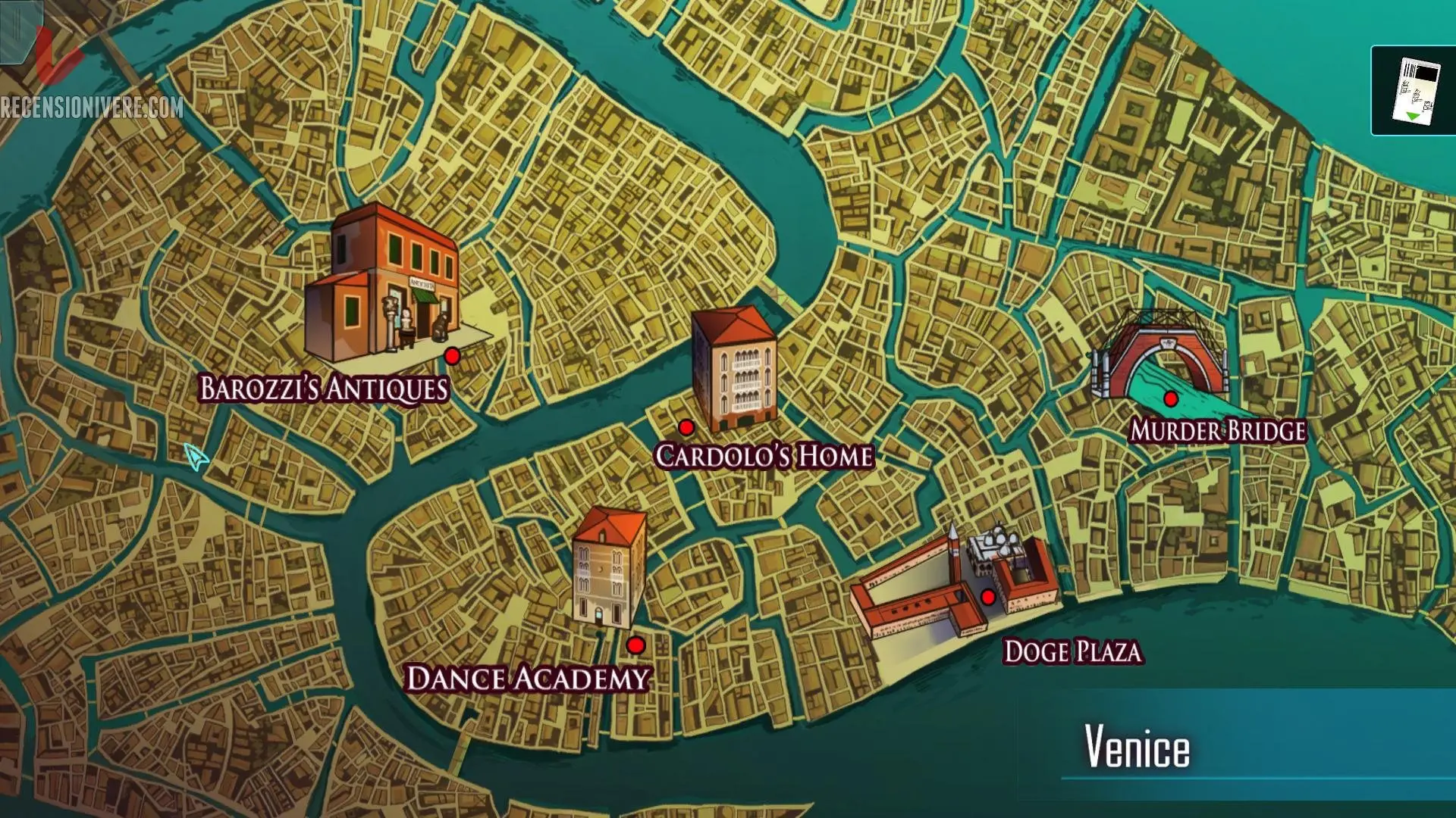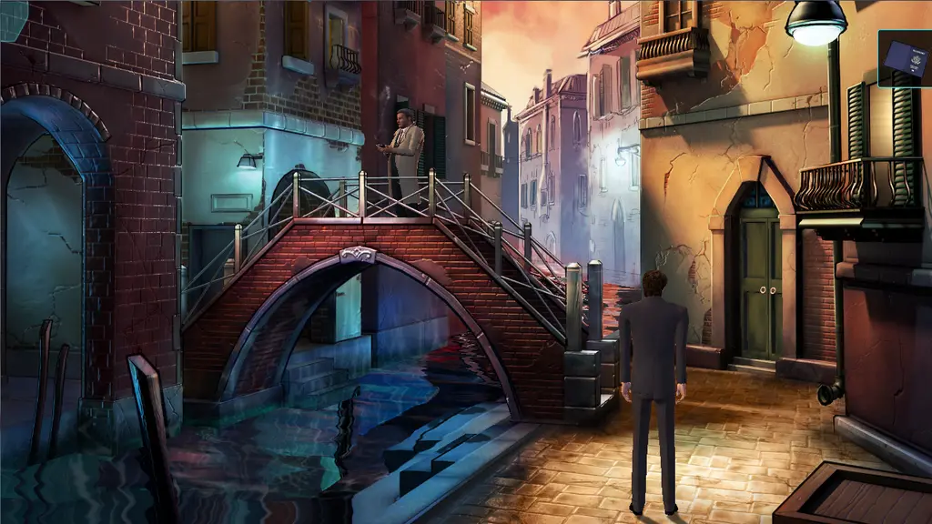 The first chapter of the game is set in Venice: the protagonist, antiques dealer Malachi Rector, must investigate the death of Bianca Cardolo, a young noblewoman who has been killed in mysterious circumstances. The city is represented through a map of the narrow streets, while the locations in which the action takes place are the interior of the victim’s home, in which the woman lived with her husband, an antique shop and two exterior locations. Malachi meets Detective Brunetta on the bridge on which the crime took place. Later on, he contacts and meets a friend of the victim at a bar in the square in front of the Doge’s Palace.