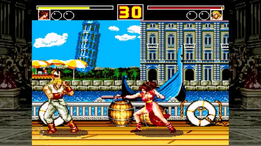 Andy Bogard, the brother of Terry Bogard – the protagonist of the series – has moved to Venice. The Italian stage is located on a boat deck. Italy is frequently used as a setting in fighter games, given that its art cities and landmarks are universally recognisable. In this genre of game, the settings remain mere background elements, and don’t really play a prominent part in the narrative. Nonetheless, it’s worth taking a closer look at them: they are after all still an example of Italy seen through the eyes of foreigners. In Fatal Fury 2 and Fatal Fury Special, the setting in which we see Andy Bogard is a sort of summary of the features that best represent Italy to foreigners: the Rialto Bridge, the Leaning Tower of Pisa, the Colosseum, and Galleria Vittorio Emanuele II appear in the background as the characters face off on a boat deck full of life jackets and wooden barrels, as it crosses an iconic Grand Canal strewn with gondolas and magnificent red and gold boats. Very picturesque.
