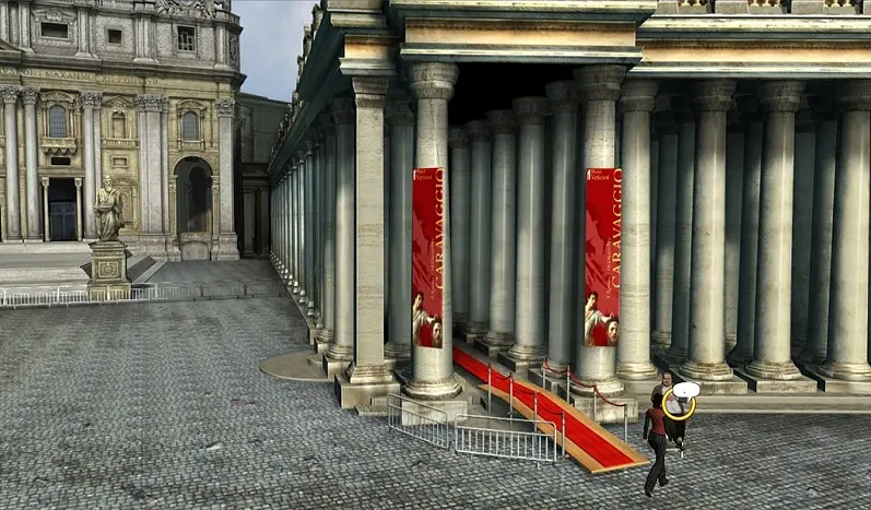 The Michelangelesque colonnade in Piazza San Pietro as it hosts an exhibition on Caravaggio