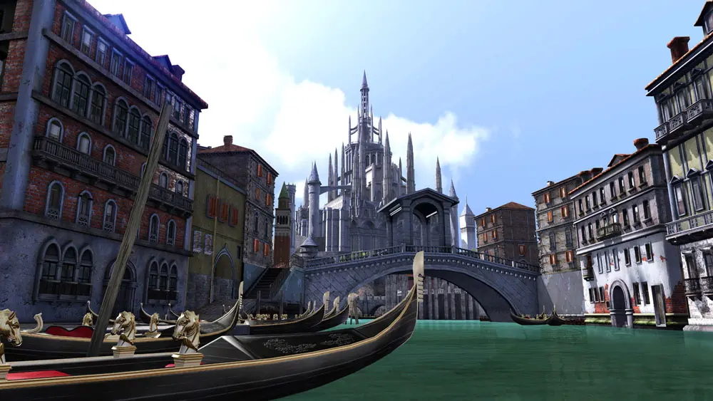 The fifth and sixth instalments in the adventure series are set in a city inspired by Venice and Italian architecture, and characterised by a B-movie atmosphere. ‘The Aqua Capital’ is in fact a reinterpretation of Venice invaded by demons and lycanthropes. Ryu must battle his way across canals and bridges, finding upgrades hidden in gondolas and in fountains. One underwater section leads him into battle with an underwater dragon, whilst running through a series of underground tunnels brings him to a reproduction of the Colosseum, renamed the ‘Lycanthropes Castle’. As he moves around the city, we see colonnades reminiscent of those at Villa Adriana in Tivoli. Last but not least, towering over the city is a huge Gothic palace resembling, as in the city of Anor Londo in Dark Souls, the Cathedral of Milan.