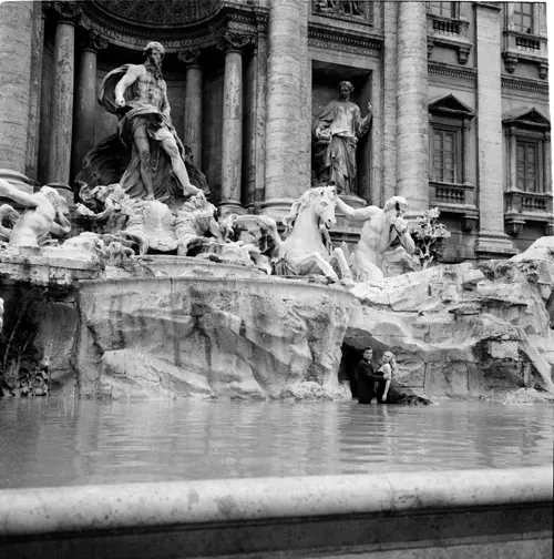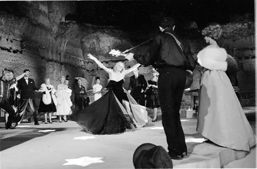 During the film, Marcello is assigned to follow Sylvia, a famous, exuberant film star. He finds out more about her when he takes her up the narrow staircase leading to the top of the Cupola of St. Peter’s (rebuilt in Cinecittà Studios), along with other reporters and photographers, and then at a nightclub set in the Baths of Caracalla, where she dances frenetically. Later they tour the historical centre of Rome where Sylvia admires the Trevi Fountain and walks into its water, taking Marcello with her: they kiss, in one of the most memorable scenes that cinema can remember.