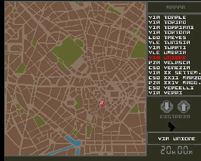 The player moves inside a map which is clearly modelled on the real-life grid of the capital of Lombardy. It features, for example, Parco Sempione, Milan’s green lung, while the roads also follow a layout that is true to life: see via dell’Unione, headquarters for the Investigation Agency Nemesis in the game. Other points of interest featured are corso Garibaldi, piazza Borromeo, via Pirelli, via Manara, Piazza XXIV maggio, Piazza del Duomo, Piazza Affari, via Legnano, via Ozanam, via Machiavelli, via XX settembre, via Piemonte, via Lamarmora, via California, via Domodossola, via Ponte Vetero, via Pontaccio, via Monte Rosa, corso Monforte, viale Coni Zugna, via S. Damiano and via Palestro (known sadly for the terrorist attack of July 1993).