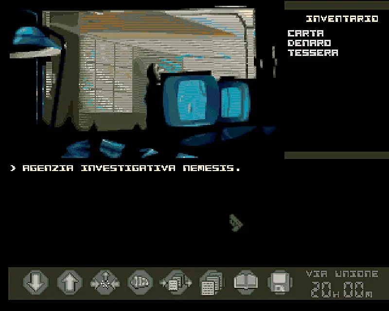 A graphic adventure released by the prolific software house from Bologna, Simulmondo. The player is a private detective working to solve the mystery about the death of the entrepreneur Victor Erni following a road accident. The atmosphere is unashamedly noir and cyberpunk. Although the cover image appears to show a typically American city, this is actually a future Milan as imagined by the developers from Bologna.