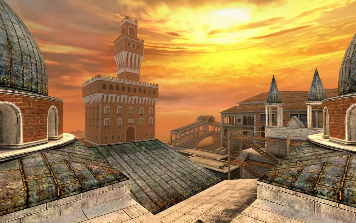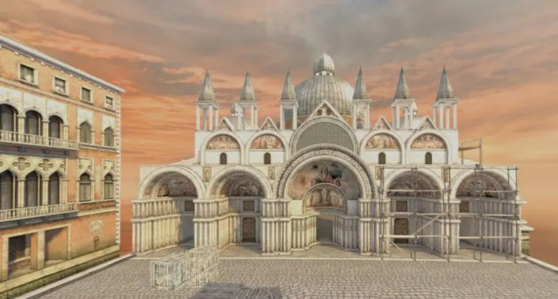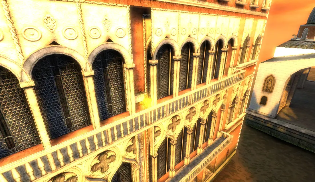 As the fifth episode of the adventure opens, the player is exploring a desolate city called “City on Water”. Surrounded by an infinite stretch of water, at close quarters the city resembles Venice: many of the buildings are inspired by those of the capital city of the Veneto Region, including the Basilica of St. Mark, the Rialto Bridge and the Doge's Palace. One of the buildings, however, evokes Palazzo Vecchio in Florence. More generally, the location appears to be the famous lagoon city in an apocalyptic perspective, set for the occasion in a noxious colour palette of oranges and yellows that evokes the sensation of being surrounded by the vapours of hell, suitably desertified and filled with horrible adversaries, ready to attack the player from every palazzo, calle and canal.