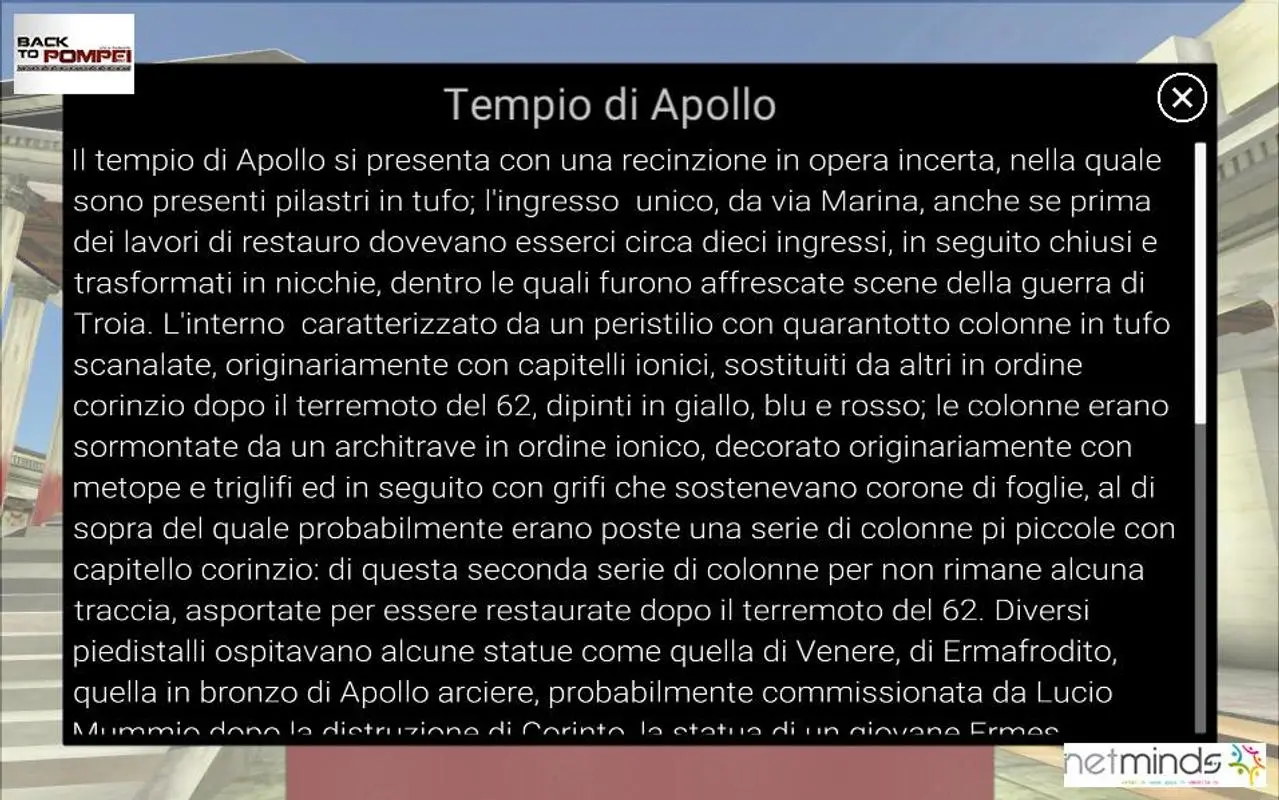 Application that uses virtual reality to offer an exploration experience of the city of Pompeii, digitally created and brought back to its ancient splendour with 3D graphics. The area can be explored both traditionally, with a visor and a touch joystick to go back and forth, or using augmented reality: the application works when geolocalization, in specific points of interest, activates audio commentary on the user’s location. This way, Back to Pompei becomes not only a fascinating tool for exploration and reconstruction but also an valid virtual alternative to the classic audio guide.