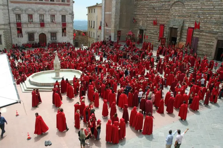 We see Bella and Edward’s sister, Alice (Ashley Greene), racing down the little roads around Montepulciano and the Temple of San Biagio, in a bright yellow sports car, where the camera immortalizes large swathes of the green Tuscan landscape. On reaching the city gates, Bella gets out of the car and runs under arches and down the streets and alleyways of the historical centre, to piazza Grande and the Duomo, where the celebrations for the patronal Feast of St. Mark are underway. Edward has decided to show his true nature in public on this occasion so that the Volturi will stop and kill him. Bella pushes her way through the crowded square and heads towards the Renaissance Palazzo del Comune, crossing a seven metre central fountain that faithfully reproduces the details in the book.