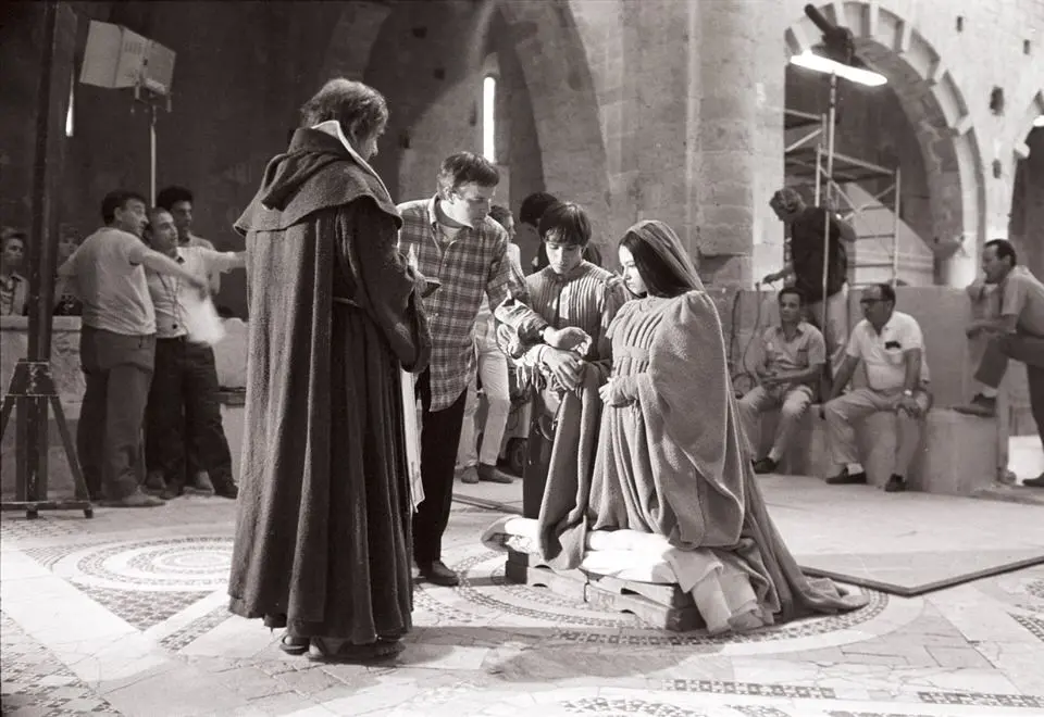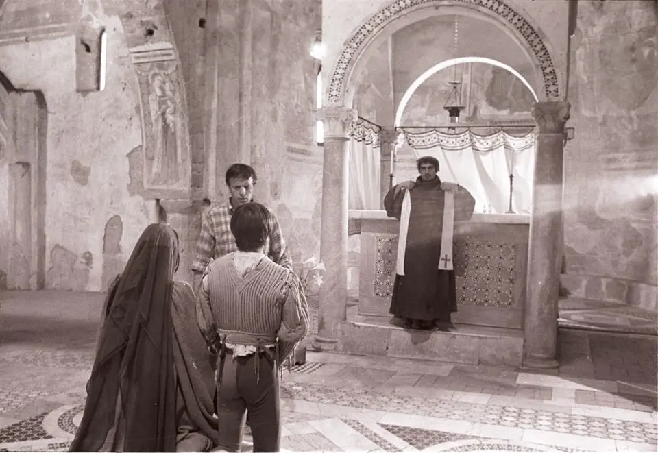Some scenes were shot in the piazza of the medieval village of Tuscania (VT) and inside its Basilica of St. Peter where Friar Lawrence meets and later marries the two young lovers. The crypt here stands in for the interior of the Capulet vault where the couple dies. The exterior of the church, including the imposing staircase, the piazza and surrounding buildings were recreated at Cinecittà.