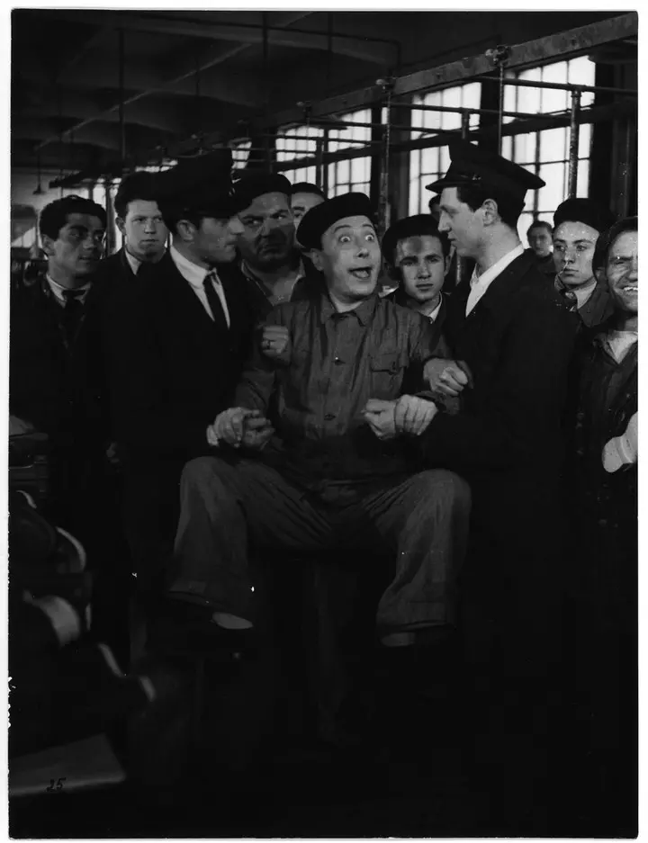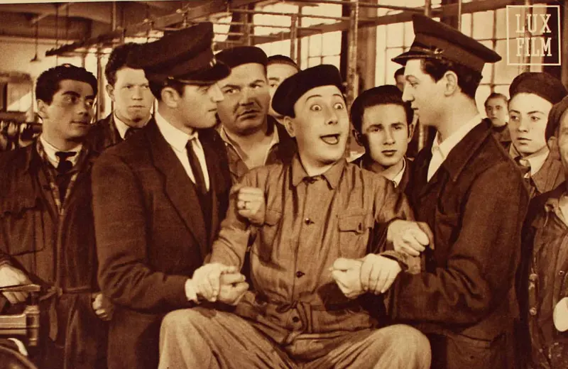Cleared of theft in a trial, Felice walks out of the doorway in the Pietro Micca Barracks in via Sebastiano Beato Valfrè in Turin. A sequence of misunderstandings has the tramp is misidentified first as an entrepreneur and later as a policeman charged with stopping the workers protesting their dismissal in piazza Bodoni.
