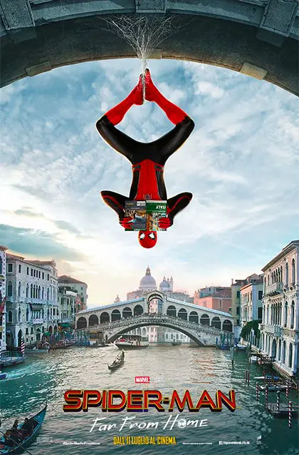 Peter Parker’s class trip starts in Venice. Their travels embrace the iconic places of the lagoon city, the canals (and de rigeur gondola excursion), piazza San Marco and the Rialto bridge. It’s here that the first threat is revealed, an enormous water monster that a mysterious being, later referred to as Mysterio, manages to defeat with the assistance of Peter’s spidey powers. A change of schedule takes the whole class to Prague where the monster is due to reappear (instead of Paris), while the epilogue with the final battle and the enemy’s inevitable defeat (if that is really certain..) takes place in London.