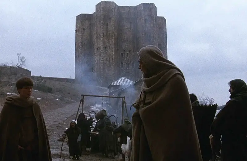 The abbey’s surroundings (seen in the distance as the two protagonists arrive at their destination) are those of Campo Imperatore in Abruzzo, although filming never took place there: instead, the production used photos of the territory of Barisciano and the Campo Imperatore plateau editing them into the sequence where the friars on mules are heading to the monastery. This snowy, evocative setting also features the tower of Rocca Calascio in the distance.