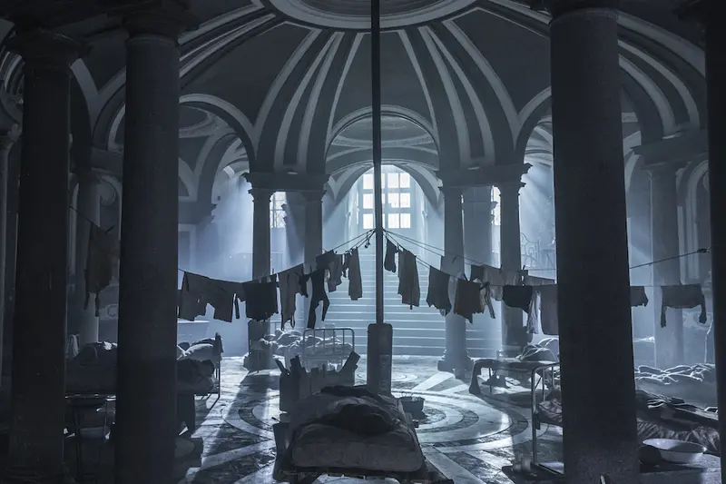 Sets recreating the dressing rooms and wardrobe department of Teatro San Carlo were built in the former NATO area of Bagnoli, as was via Toledo in the 1930s with its shops including that owned by the Colombo family which attracts the commissioner’s attention. The steep, stepped alleyways that appear to be the historical centre of Naples actually hide the postierle, as the streets that connect the lower and upper parts of Taranto are known: the Apulian town also provided locations in via Duomo, via Nuova and several interiors. Locations in Portici included the Reggia which stood in for a hospital and the former Landriani College.