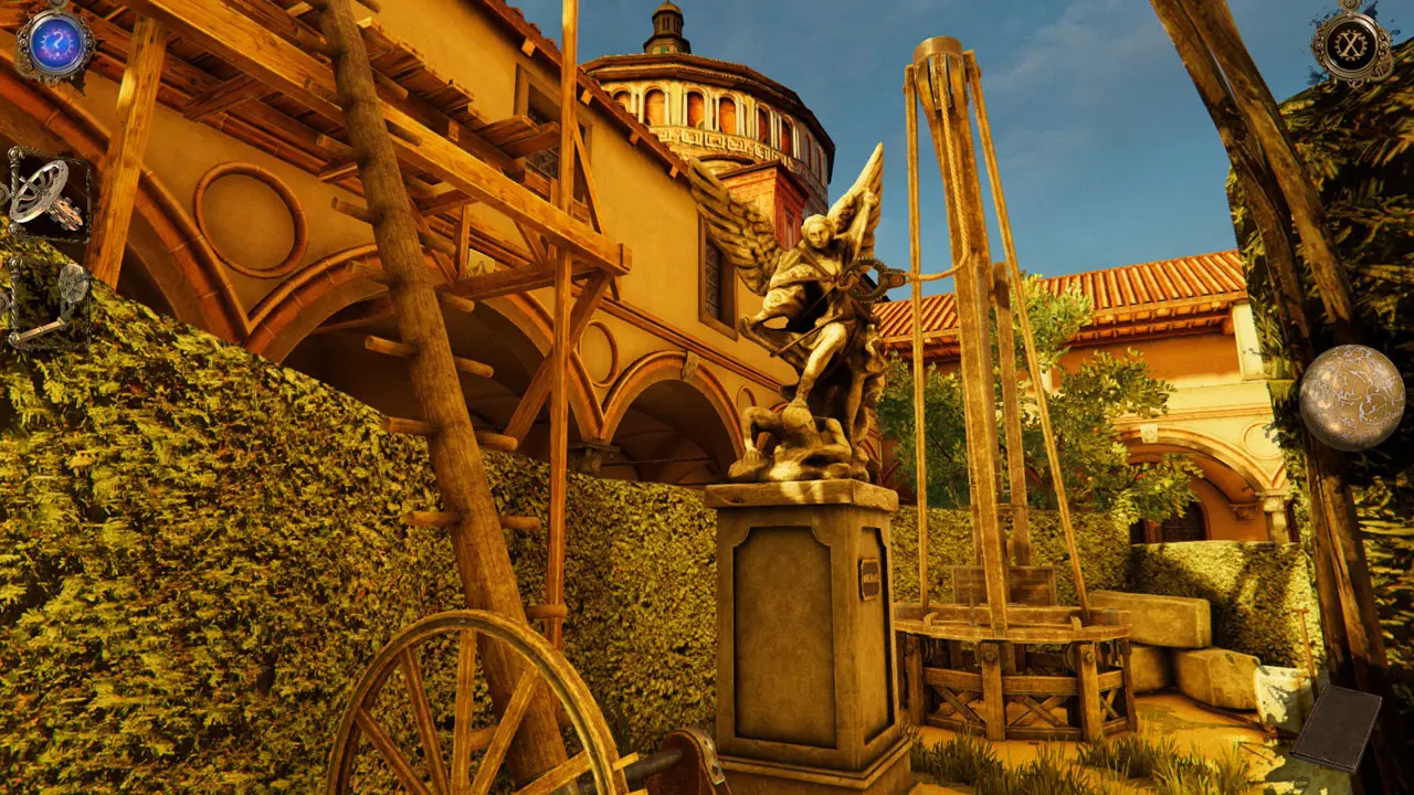 While the first episode was set only in Florence, in Leonardo’s studio, the second has wider horizons and adds numerous locations to the character’s path. Starting point is the Estense Castle of Ferrara, followed by the Church of Santa Maria delle Grazie and Corte Vecchia (where Palazzo Reale is located) in Milan. The journey continues to Florence, to the Abbey of Santa Maria. Then the adventure moves to Piedmont, to the Sacra di San Michele. The intention was more to create a historical and narrative context for the multiple puzzles than a faithful, omni-comprehensive reproduction of places (although several views are easily recognised).