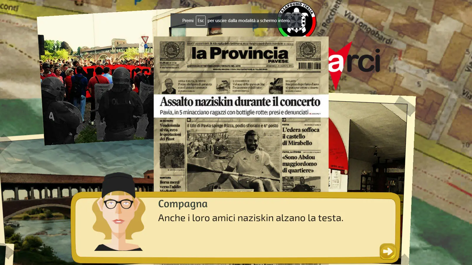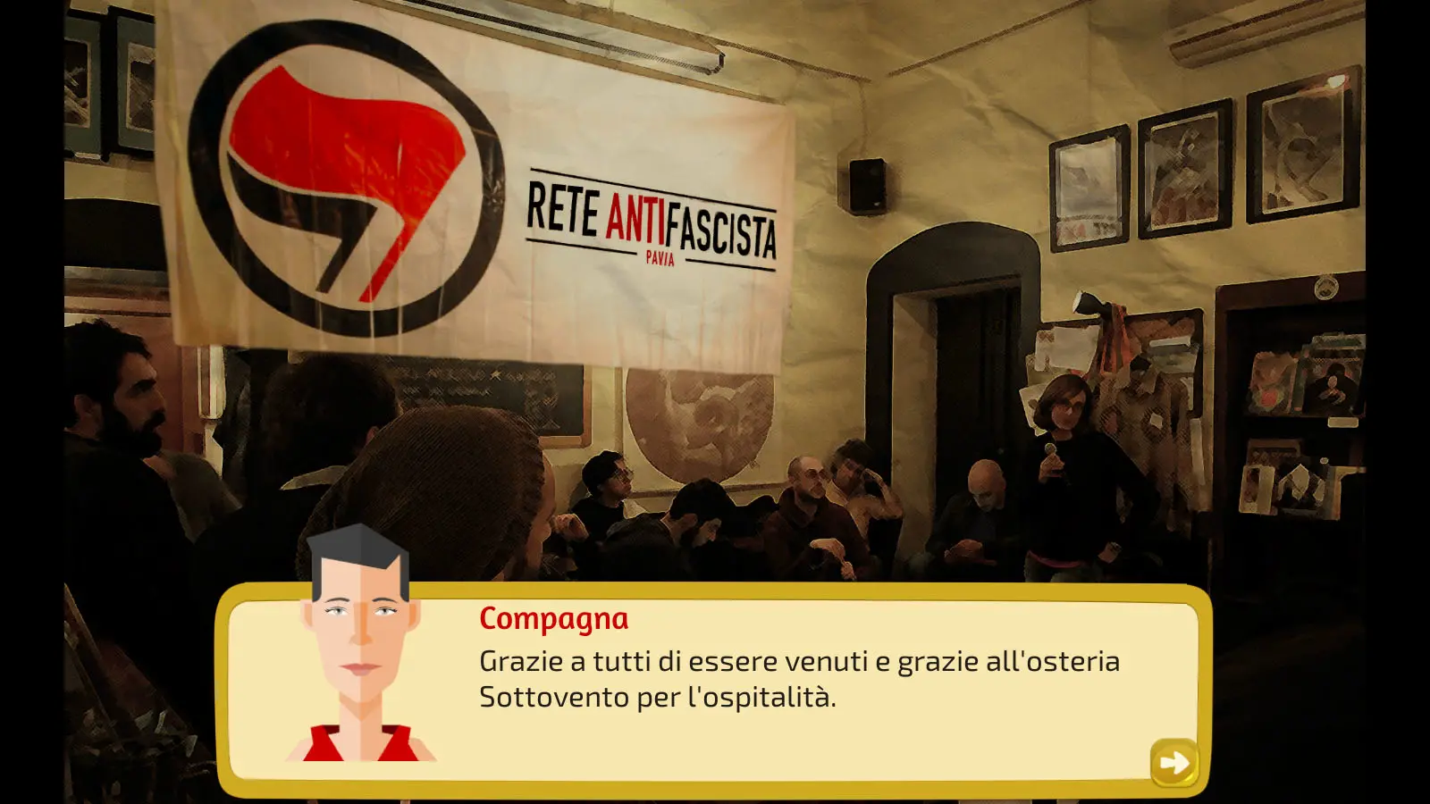 Described by the creator as a “gaming leaflet”, Litte Antifa Novel is a visual novel created to record events in Pavia during a Neofascist procession held annually (until 2016) to commemorate Emanuele Zilli, a militant in the MSI organization, who died in Borgo Ticino in 1973. The game asks the player to organize the counter protest – promoted by the Rete Antifascista Pavia and ANPI – that really took place on 5 November 2016. Moving through a route of choices, the player has to decide how to behave and which ethical and organizational behaviour to adopt. The game has been the target of heated political controversy since publication.