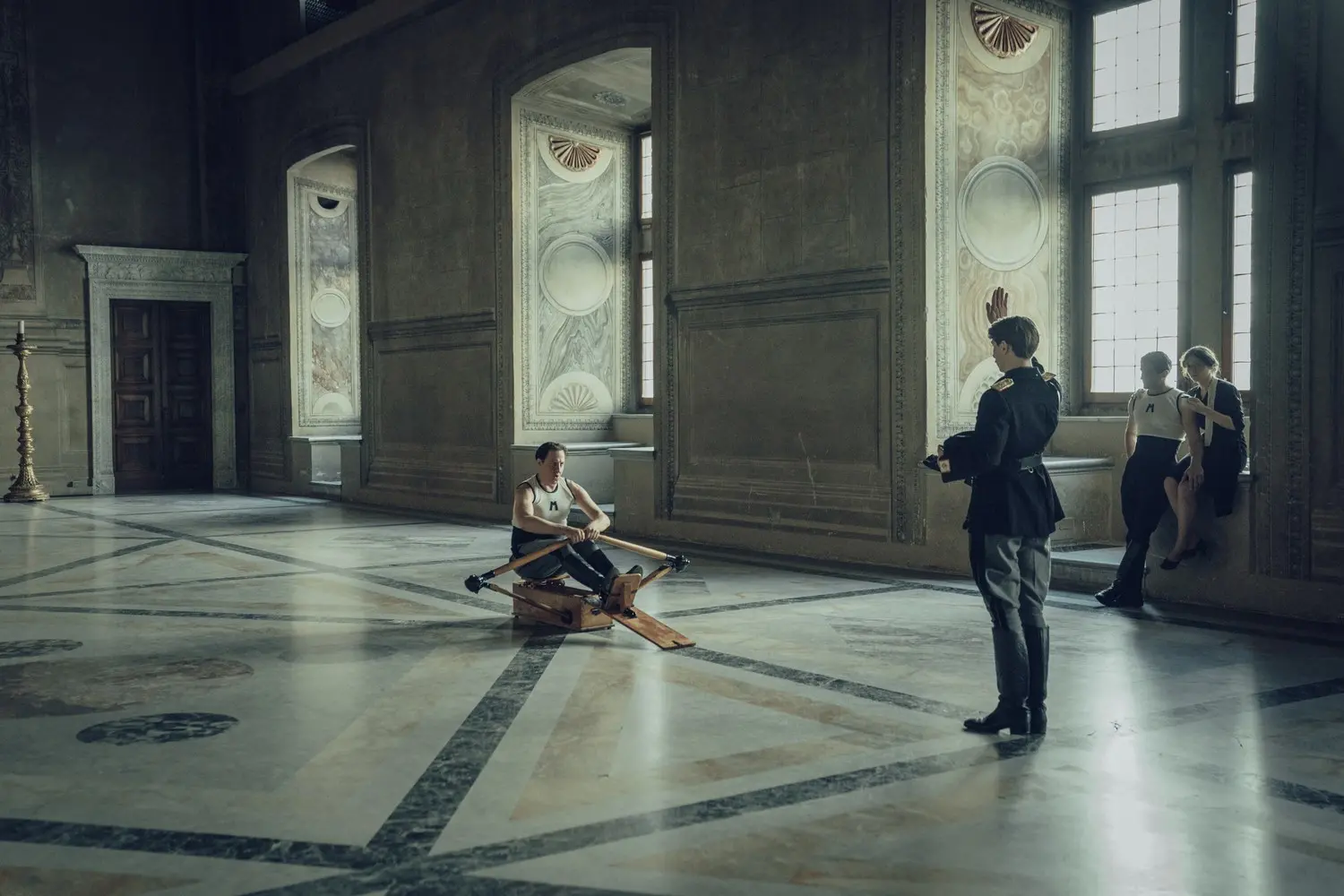 Shortly after his appointment, Comini is summoned to Palazzo Venezia in Rome where he is asked to keep an eye on the “Vate” (“Poet”) Gabriele D’Annunzio, who is making Mussolini uneasy and is perceived as a threat to his plans of expansion. His entrance into the building is preceded by a long walk along the colonnade of the Vittoriano where the segretario federale looks over piazza Venezia as Mussolini’s booming speech rings out.