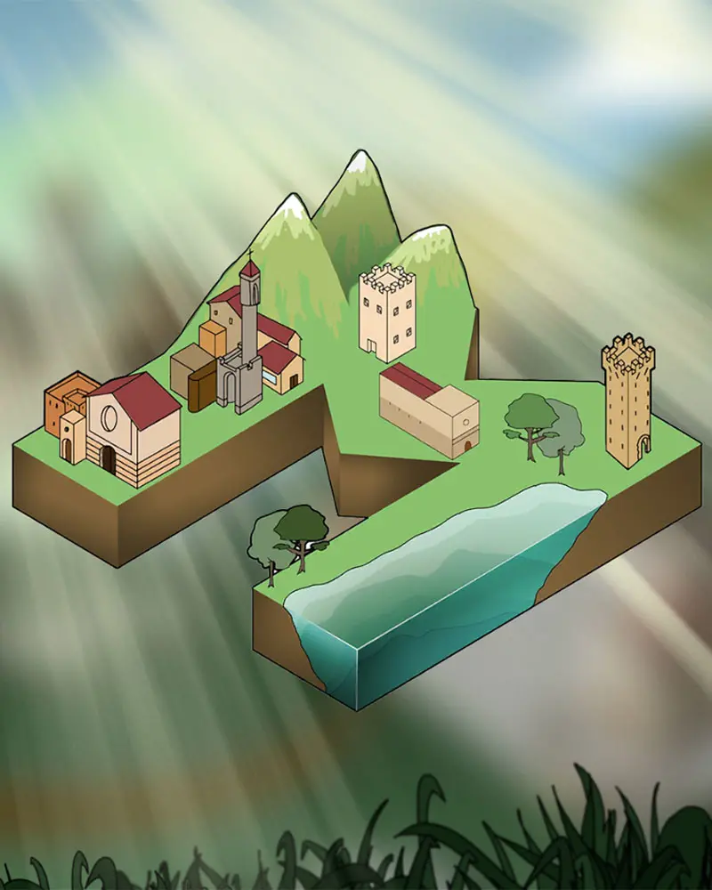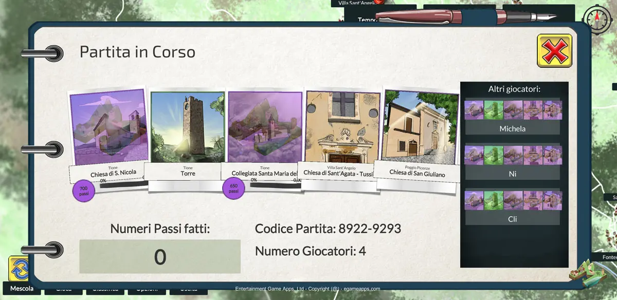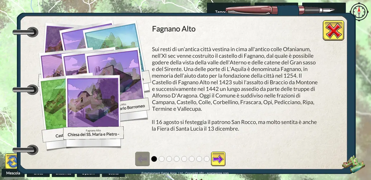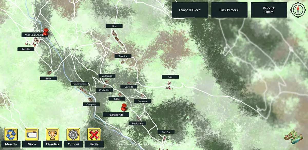 The eleven municipalities involved in the project are all featured on the game map: Acciano, Barisciano, Fagnano Alto, Fontecchio, Fossa, Ocre, Poggio Picenze, San Demetrio ne’ Vestini, Sant’Eusanio Forconese, Tione Degli Abruzzi, Villa Sant’Angelo. The images show specific places in these municipalities: there are 100 locations in the game (more can be added in the future). These include the Hermitage of St. Roche (Fagnano Alto), the Church of the Angels (Sant’Eusanio Forconese), Ducal Palace (San Demetrio ne’ Vestini), the Fountain of St. Roche (Poggio Picenze), the Convent of St. Colombus (Barisciano), the Necropolis of Fossa, the Belvedere di San Martino (Ocre) and many others.