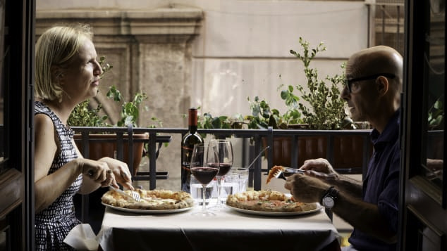 Elisabetta Moro and Stanley Tucci eat pizza in Naples