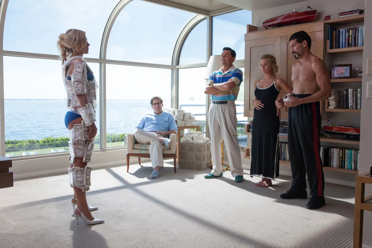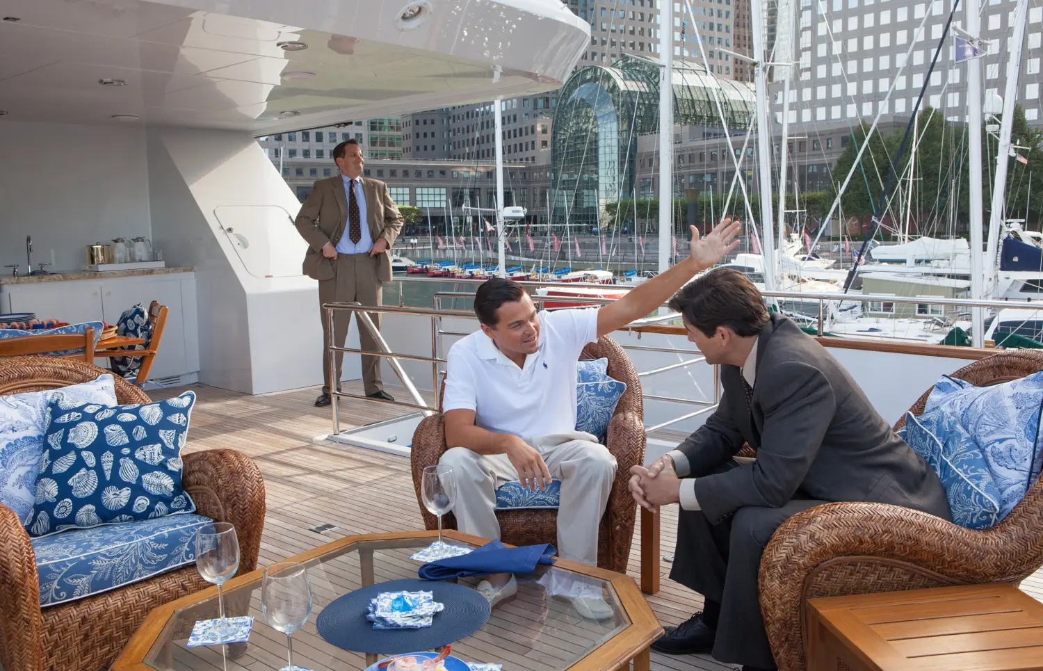 To evade investigation and avoid the discovery of his illicit dealings, Belfort heads to Italy by yacht, continuing to run the company from a distance. Shooting in Italy took place without the director or actors and was amalgamated in postproduction to create a backdrop. The seafront village of Portofino in Liguria is clearly recognisable with its pastel-coloured houses and picturesque harbour that welcomes boats of all sizes while Chiavari and the Cinque Terre are also featured.