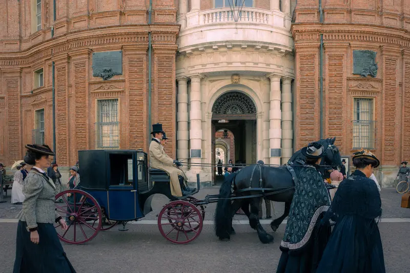 Central piazza Cavour provided the exteriors for the family residence, Villa Barberis, whose interiors were created in Villa San Lorenzo, Racconigi.