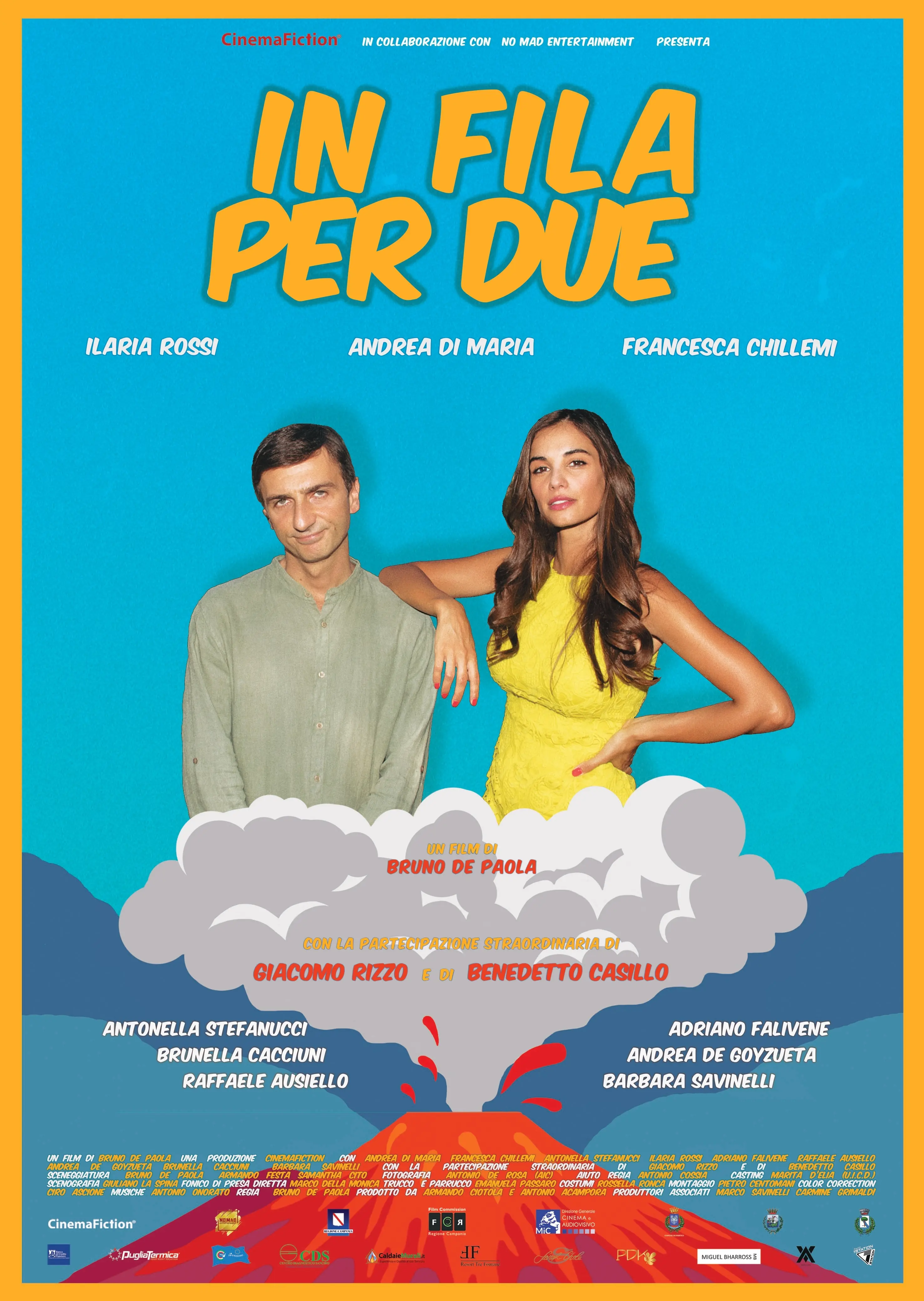 In fila per due by Bruno De Paola stars Andrea Di Maria and Francesca Chillemi, with Ilaria Rossi, Adriano Falivene, Antonella Stefanucci, Raffaele Ausiello, Barbara Savinelli, Brunella Cacciuni, and special appearances by Benedetto Casillo and Giacomo Rizzo.