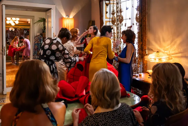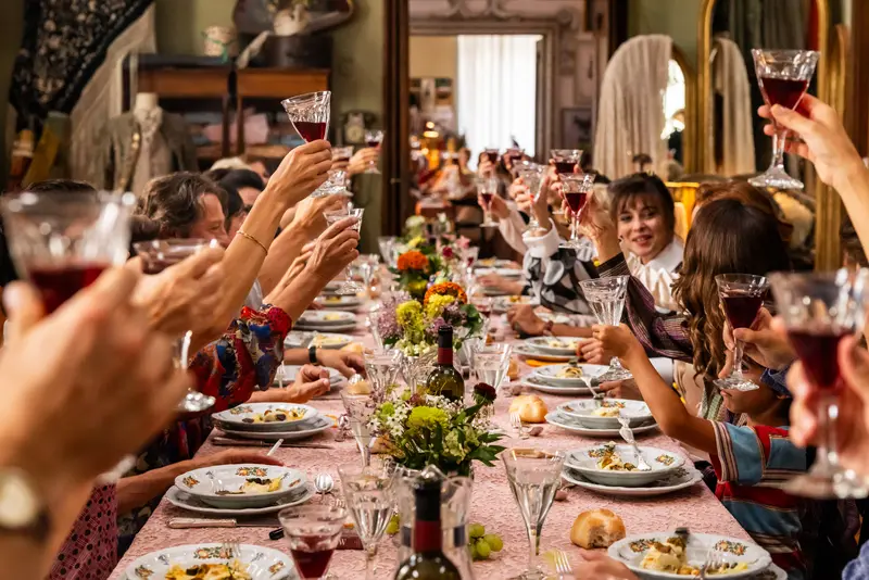 Diamanti is a tribute to the profession of the costume designer. "Ferzan wanted me to come on board during the writing phase and so I was able to tell the screenwriters Carlotta Corradi and Elisa Casseri, about anecdotes, tics, superstitions, and, above all, imagine what this dress that the women work on laboriously throughout the film would be like, all its phases and iterations, like a great collective architectural work that will finally unite them in perfect harmony” explained costume designer Stefano Ciammitti. “Sartoria Tirelli Trappetti welcomed us into their archives: photographs, textiles, endless dresses; above all they welcomed the actresses who wanted to know and learn directly from the gestures and words of the seamstresses who work tirelessly and with infinite passion every day. We were able to document the making of the red dress - which required more than 160 meters of fabric, all lined with black crinoline - before putting it on stage”.