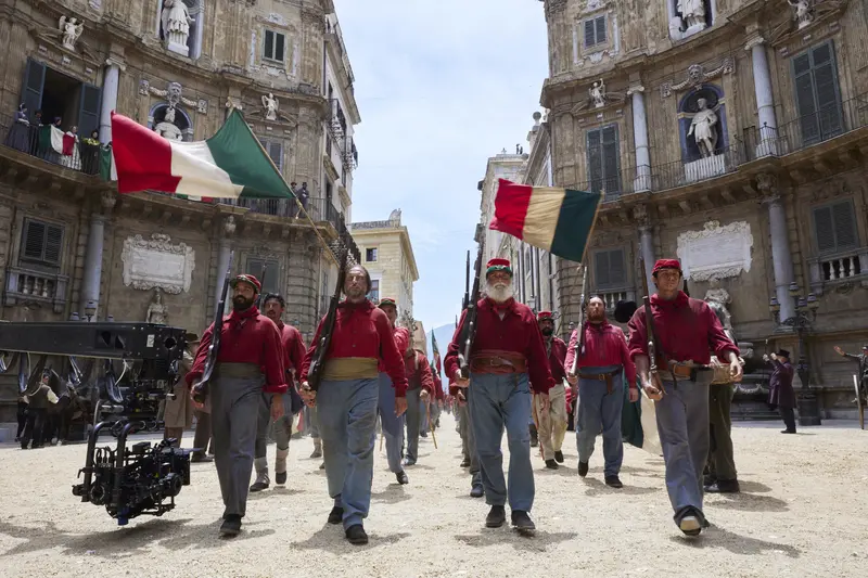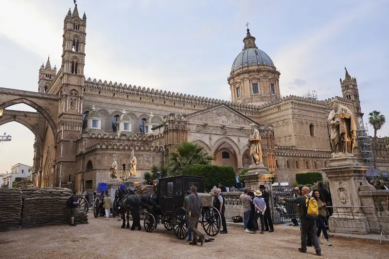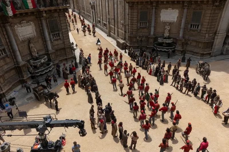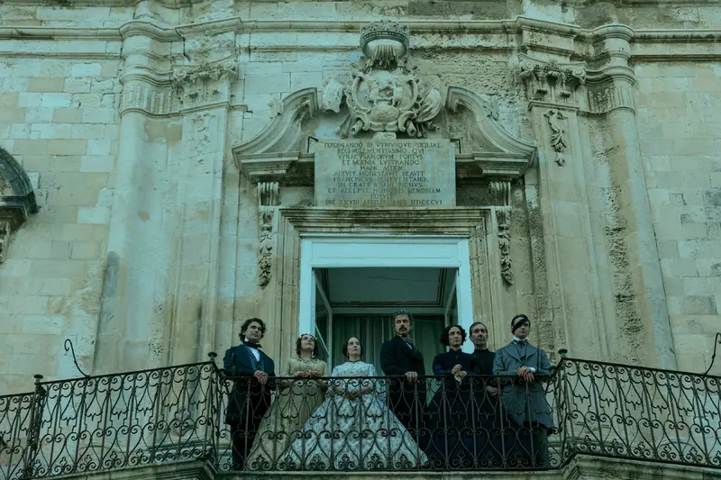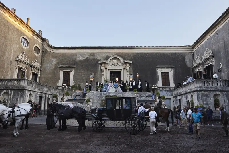 The 18th-century Villa Valguarnera in Bagheria was chosen to represent Villa Salina, a focal point of the story as the family residence of Prince Fabrizio Corbera (Kim Rossi Stuart). It has also featured in Valeria Golino's The Art of Joy (2024), Niccolò Ammaniti's Anna (2021), and Ferzan Özpetek's The Goddess of Fortune (2019). The dramatic structure, with lateral wings that act as exedras to the recessed central body, contrasts with the interiors, provided by Palazzo Comitini, now the headquarters of the City of Palermo (the sumptuous sala Martorana was repeatedly used as a location).