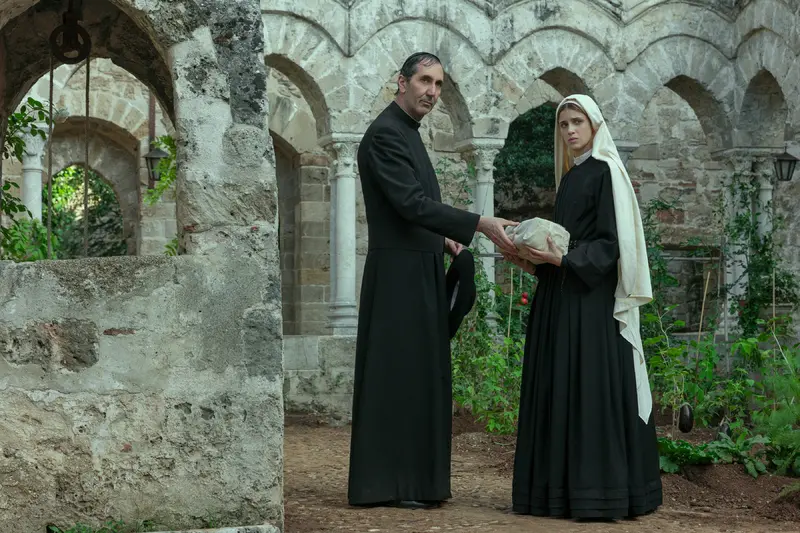 In Episode 1, this building, plus the Teatini Church opposite, provides the exteriors of the fictional Convent of the Sacred Redeemer, where Concetta (Benedetta Porcari) is living at the beginning of the story and where she later returns heartbroken by the union between Tancredi (Saul Nanni) and Angelica (Deva Cassel). However, the interiors of the church are actually those of the Church of Santa Maria dell'Orto in Trastevere (Rome), which has a large M for Mary on the back window. In Episodes 3 and 4, Concetta and other characters are seen in a cloister with pointed arches supported by twin columns with the red domes in the background. Although the domes those of the Church of San Cataldo seen alongside the Martorana, the cloister itself is the 12th-13th-century cloister of San Giovanni degli Eremiti, with its lush vegetation and distinctive Norman well, built on the site of an earlier Arab cistern.