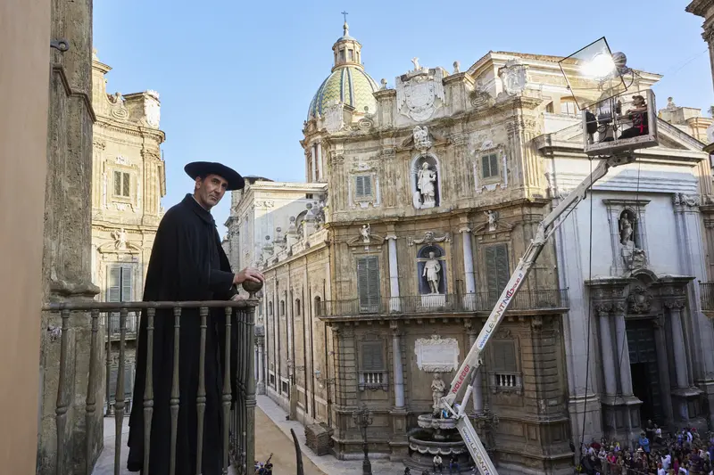The series opens with a tracking shot that descends from above the octagonal lantern of the bell tower (c. 1690) of the Church of San Giuseppe dei Teatini with its twisted columns, and polychrome majolica dome (1724) to the scenic Pretoria fountain in the square of that name, with the Church of Santa Caterina d'Alessandria in the background.