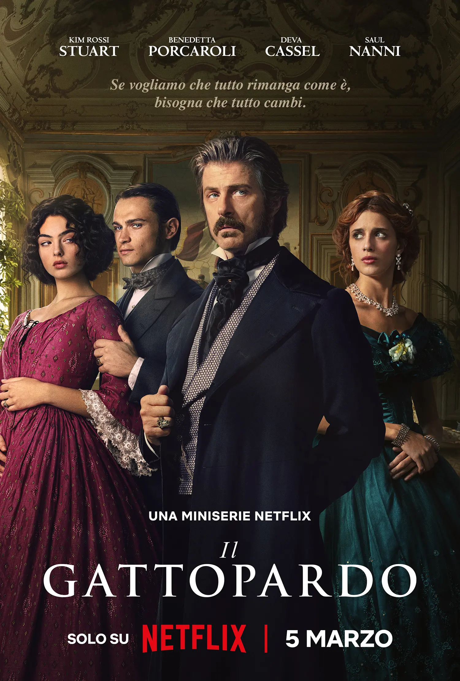 The cast includes Kim Rossi Stuart as Don Fabrizio Corbera, Prince of Salina; Benedetta Porcaroli as Concetta; Deva Cassel and Saul Nanni as Angelica and Tancredi; Paolo Calabresi, Francesco Colella, Astrid Meloni, and Greta Esposito.