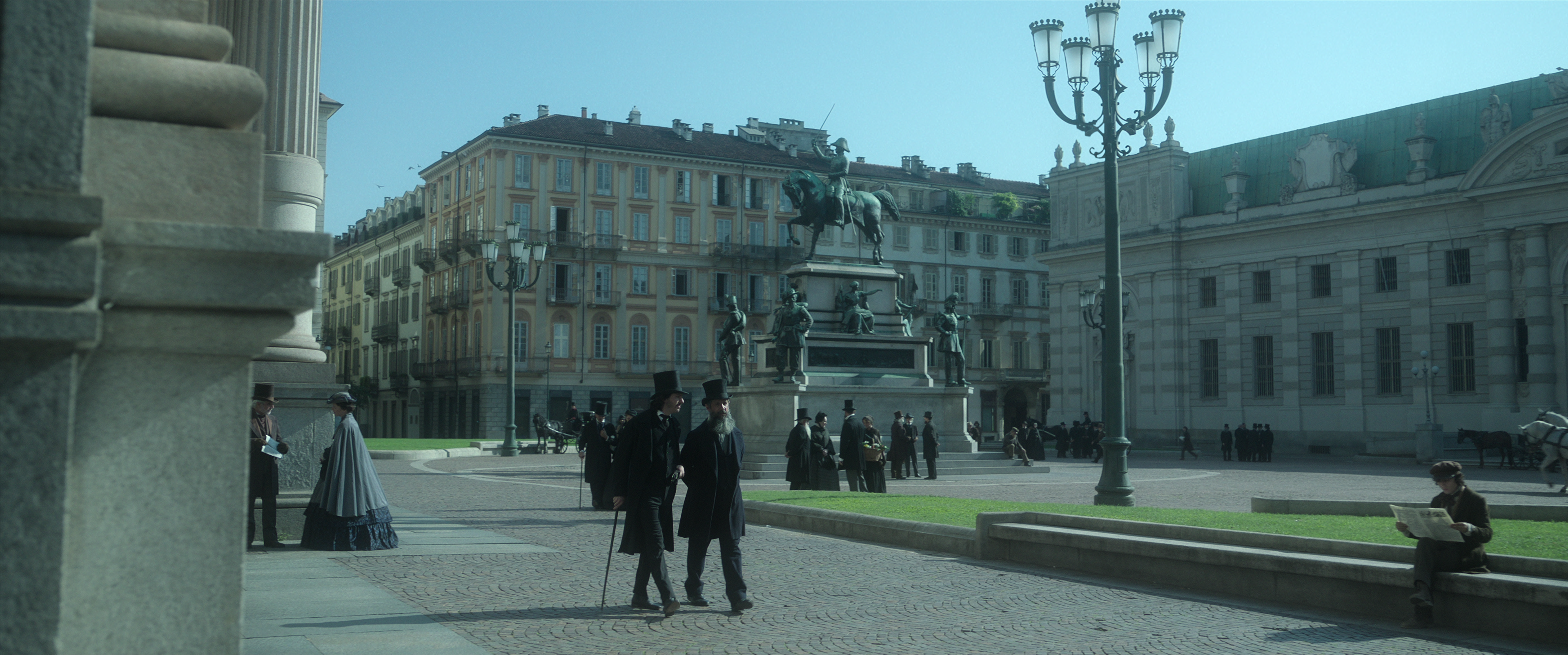 Exterior scenes, featuring extras in period costumes and 19th-century horse-drawn carriages, were also shot at: piazza Palazzo di Città and the Park Caduti dei Lager Nazisti; while Palazzo Carignano, Palazzo Birago di Borgaro, and Palazzo Cisterna provided other "Turin" interiors.