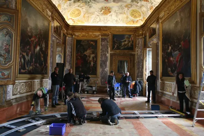 Disappointed when his love for Fanny is not reciprocated, Giacomo moves to Rome with his friend Ranieri. They arrive in the eternal city through the Parco degli Acquedotti. In Rome, Giacomo goes in search of his uncle, Carlo Antici, and waits for him for a long time in a lavish room. We’re actually in Macerata, in the Hall of the Aeneid of the 18th-century Palazzo Buonaccorsi, today home to the town’s museum.