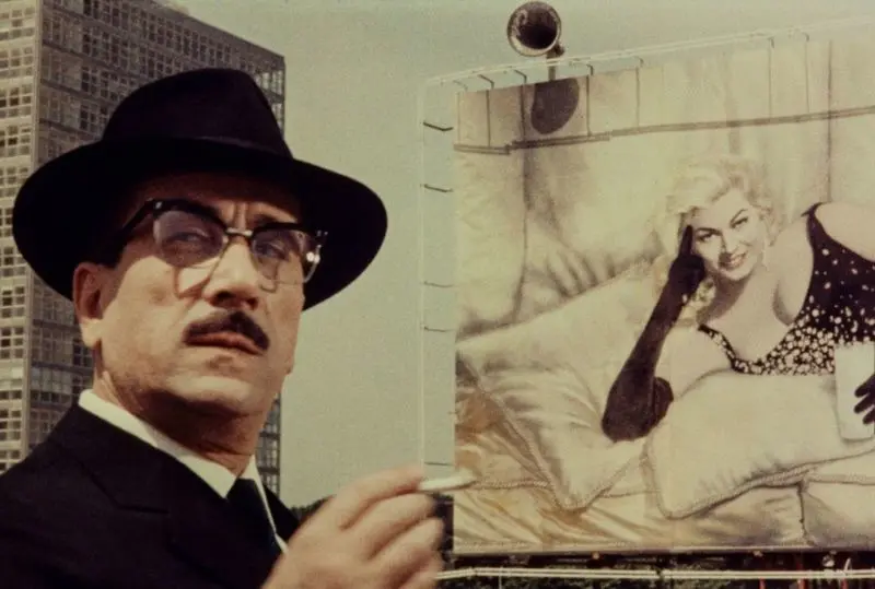 However, the Rationalist architecture of Eur is best displayed in Fellini’s episode of Boccaccio ‘70 - Le tentazioni del Dottor Antonio (1962). The film opens with several scenes that immortalize carefree moments: a photo shoot on the steps of the Basilica dei Santi Pietro e Paolo; bathers in pedal boats on the Eur lake; people relaxing near Palazzo della Civiltà Italiana; a woman sitting “provocatively” near the colonnade of the Museo delle Arti e Tradizioni Popolari. This peace is disturbed by Anita Ekberg or, rather, by her image which is printed on an enormous poster looming over a field (today there is a building) that borders viale Shakespeare. This becomes a nightmare for Antonio (Peppino De Filippo) who sees it every day from the window of his home, only to find her materialize before him one ghostly night: in viale Civiltà Del Lavoro, with the well-lit arches of the square Colosseum providing the background.
