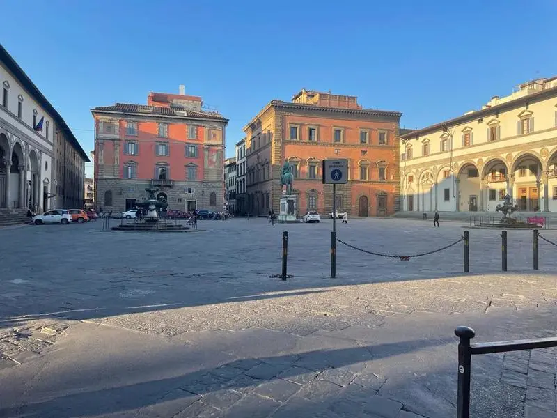 Porticoes on three sides surround the central statue of Ferdinand I de’ Medici on horseback made by Giambologna and Pietro Tacca.