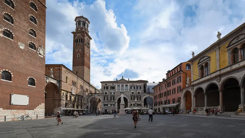 Piazza dei Signori in Verona is lined by monumental buildings interconnected by arches creating the impression of a courtyard.