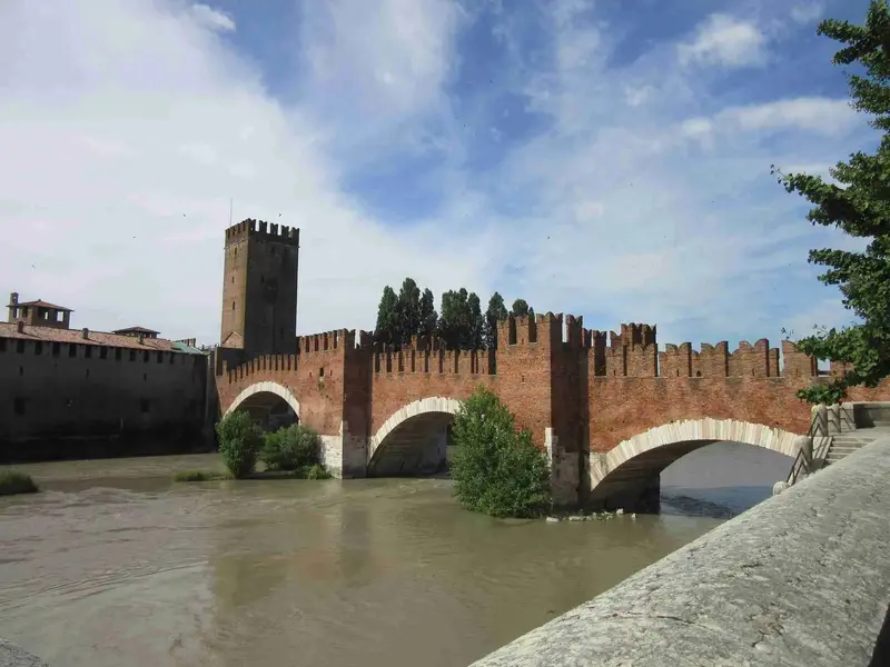 The Scaliger bridge (also known as Castelvecchio bridge), built from terracotta brick and local white stone to cross the Adige river in Verona, is a superb example of 14th century military engineering. Just over a hundred meters long, it was commissioned by Cangrande II della Scala in approx. 1355 from the Veronese architect Guglielmo Bevilacqua.