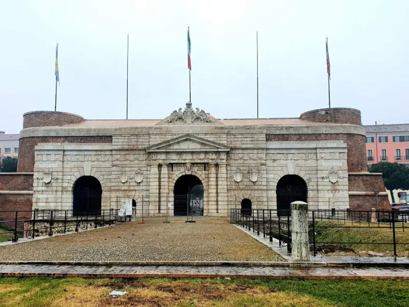 The internal facade in tuff rock features a rustic ashlar arch, in an imposing Doric frame, beneath a triangular tympanum with the city’s crest. The outer facade initially had only one Doric order arch in white stone; the Austrians later opened up two side entrances.