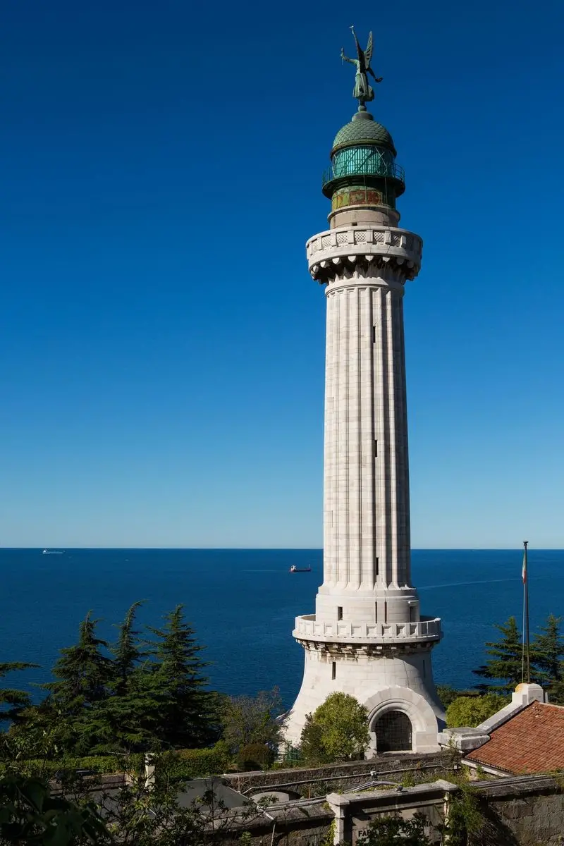 The 70-metre-high faro della Vittoria (lighthouse) in Trieste was built atop the Austrian-built fort Kressich (1854) on Gretta hill 60 meters above sea level. The panoramic viewpoint offers a breath-taking view over the Gulf of Trieste.