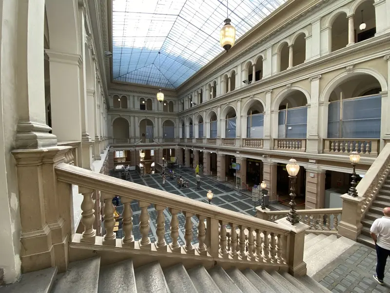 Typical of Austrian buildings of the time, it has an eclectic neo-Renaissance style. The central hall on the ground floor, with monumental staircase at the back, features a glass roof “with steel girders and the transparent part in crystal”. To the right of the spacious atrium is the Museo Postale e Telegrafico della Mitteleuropa, which conserves artefacts and images documenting the evolution of the postal service from the mid-1800s to the present-day. These include a reproduction of a late 1800s Post Office with furnishings and equipment belonging to the Royal Hungarian Post.