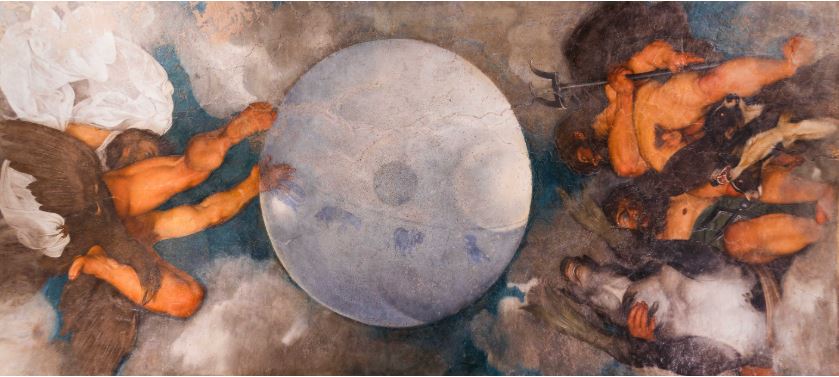 Ticket-holders to the Caravaggio 2025 exhibition, closing on 20 July at Palazzo Barberini, were given the option to book a guided tour of the privately-owned Casino di Villa Ludovisi, to admire Caravaggio’sonly wall painting, Jupiter, Neptune and Pluto (1597-99), oil on plaster, commissioned by one of his most famous patrons, Cardinal Francesco Maria del Monte, who also supported Galileo. TheCasino later passed into the hands of Ludovico Ludovisi, nephew of Pope Gregory XV (1621-23), who comissioned Guercino to fresco the ground-floor with the Carro dell’Aurora (1621), as a response to the same subject previously painted by Guido Reni (1613-1614) for Scipione Borghese in the building known today as Villa Pallavicini Rospigliosi, and so Caravaggio’s painting was forgotten.