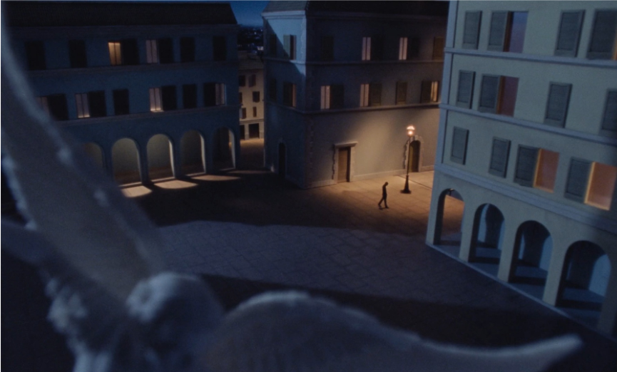 At the same time, the play of light in these scenes and, in particular, in the stop-motion cityscapes with their long shadows, harks back to the Expressionist cinema of Friedrich Wilhelm Murnau and Fritz Lang, and the use of ??models/dioramas, handcrafted by Villoresi, evokestheirextensive use in masterpieces such as Dr. Mabuse (1922) and Metropolis (1927). Once again, however, these images evoke Italian art, speakingthe metaphysical language of Giorgio de Chirico and his Piazze d'Italia (1934-1937), in the large porticoed spaces where the characters walk.
