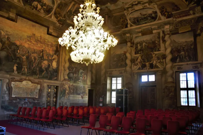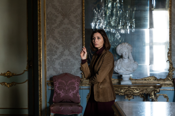 In Palazzo Chiablese’sHall of Tapestries, the President converses with the Minister of Justice, Ugo Romani (Massimo Venturiello), seated across from him at a long table, with one of the enormous tapestries depicting the Stories of Queen Artemisia (c. 1620) and one of Francesco De Mura's canvases of the Allegories of the Four Continents (1763) behind him. The room was originally the drawing room of the Duchess of Chiablese, Maria Anna of Savoy (1757-1824), used in the 19th century by Pauline Bonaparte and lateras a ballroom.
