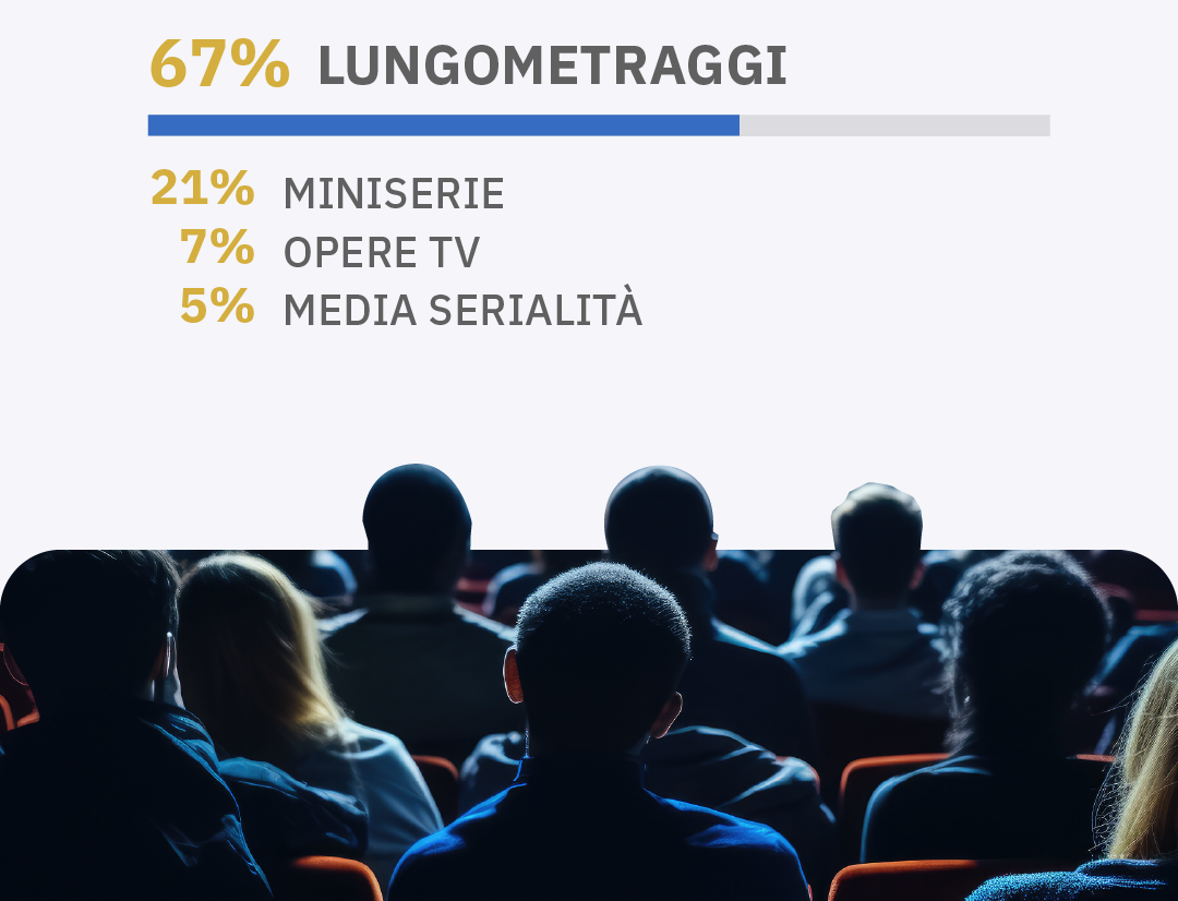I lungometraggi prevalgono tra i formati sul set nel secondo mese dell’anno, saranno infatti 29, corrispondenti al 67% del totale. Le miniserie in partenza sono state 9; 3 le opere tv e 2 le opere di media serialità.